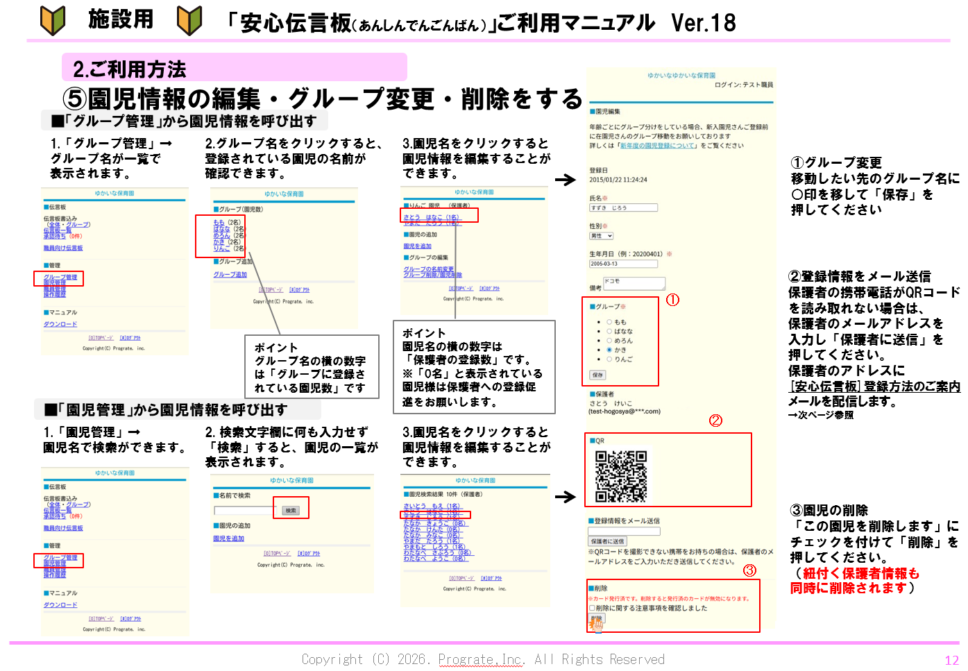 安心伝言板にログインし、「グループ管理」または「園児管理」から
