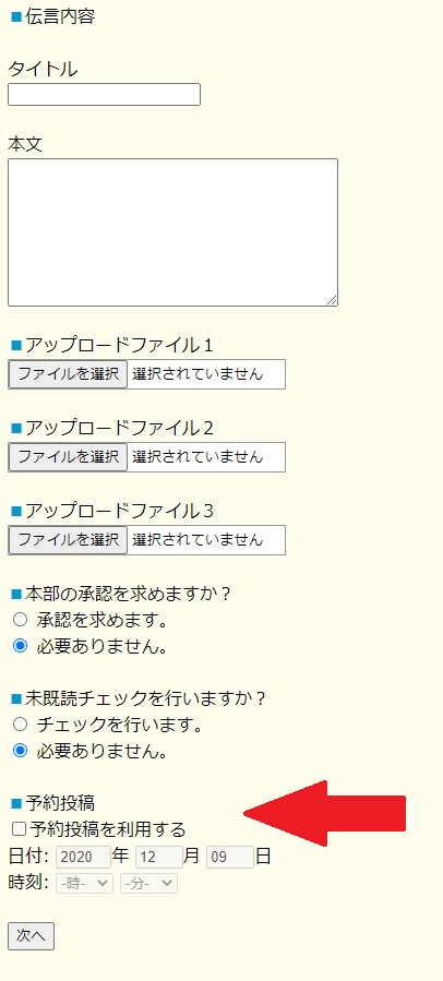 安心伝言板に書き込むページの一番下に「予約投稿」という項目がありますので
