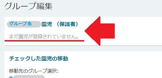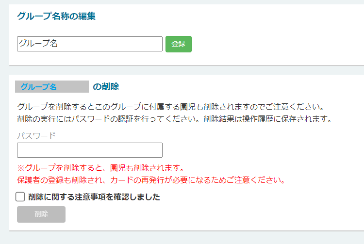 グループを削除すると、そこに所属する園児データが削除されますので