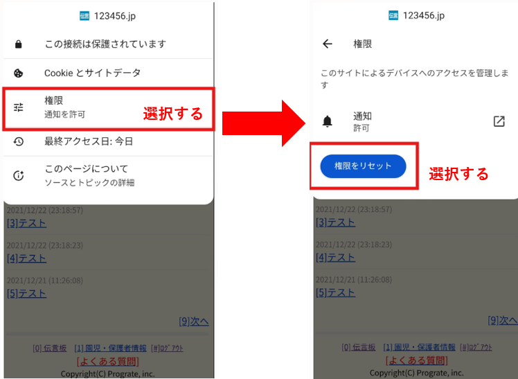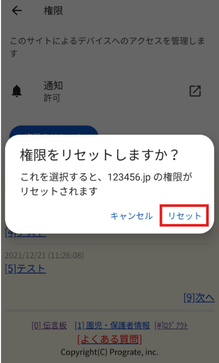 ②出てきた画面の中の【権限】を選択し、【権限をリセット】を選択する