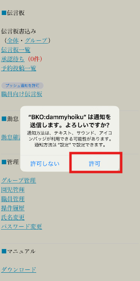 ■STEP6:「プッシュ通知を許可しますか?」と画面が出てくるので、[許可]を選択します