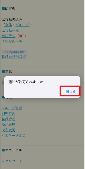 ■STEP7:[通知が許可されました]と画面がでてきたら「閉じる」を押して設定完了です