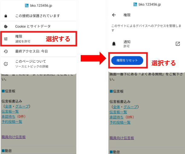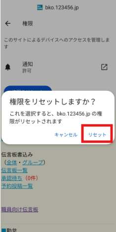 ②出てきた画面の中の【権限】を選択し、【権限をリセット】を選択する