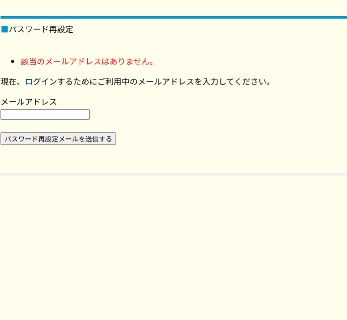 下記画像のように該当のメールアドレスはありませんと出るので、正しいアドレスをご入力ください